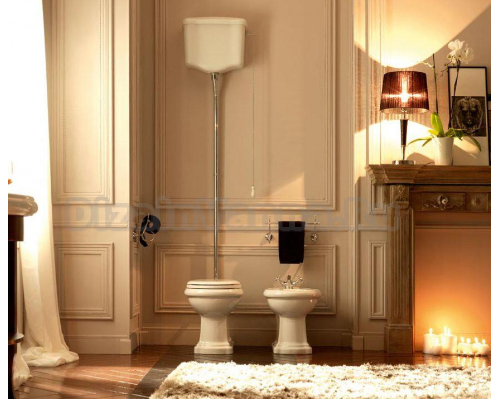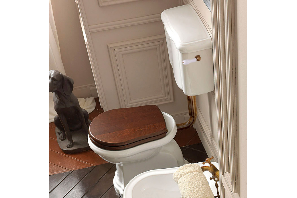Toilet retro asli bergaya tahun 30-an dibedakan oleh katup air tinggi yang terkenal, dipasang di dinding dan terhubung melalui pipa panjang dari logam krom yang terlihat. Tali rantai – terkadang diukir dengan halus – menandai kembalinya ke sumbernya. Mangkuk toilet yang lebih melengkung meninggalkan sudut siku-siku dan menggantinya dengan lekukan yang ramah, sering kali dipercantik dengan penutup kayu berwarna gelap dan dipernis untuk mengingatkan pada keanggunan art deco. Keran-kerannya berkilau berkat lapisan krom yang dipoles dan pegangan dari porselen putih.